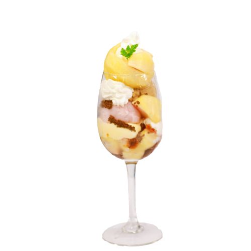 果肉がとてもジューシーでゼリーのような食感の紅まどんなをラズベリー、フロマージュブラン、スポンジケーキなどと合わせ、まるでケーキのようなパフェに仕上げました。口いっぱいに広がる甘い香りをお楽しみください。